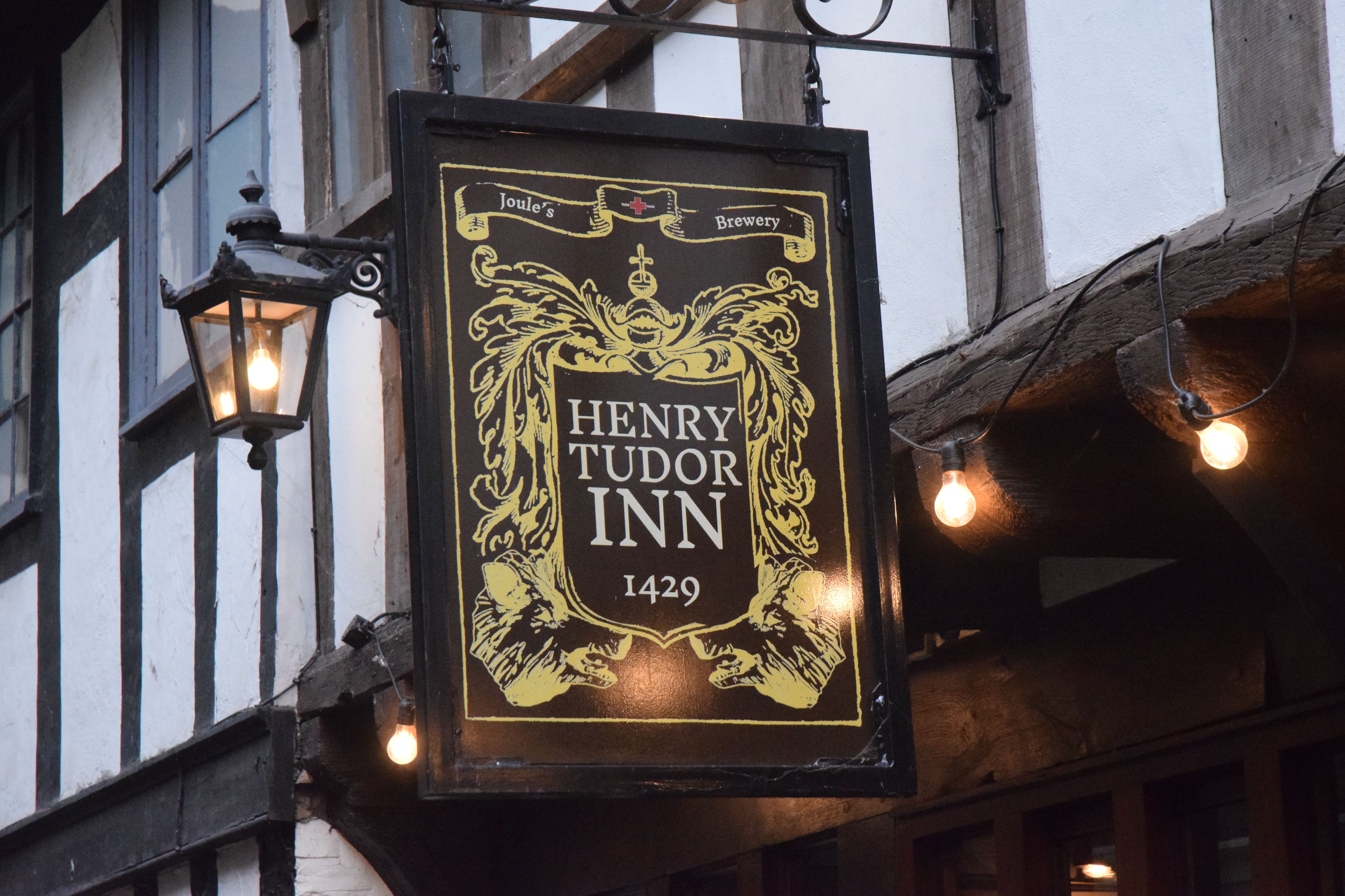 chiediamo dove si può acquistare dello Stilton Il Barman ci consiglia un negozio di alimentari li vicino e noi seguiamo il consiglio, acquistiamo lo Stilton ed anche del Cheddar e della lingua. Trasportiamo il cibo lungo una stradina di ciottolato e ci piazziamo su una botte all’esterno del “Henry Tudor Inn” dove iniziamo a rifocillarci bagnando i formaggi con 4 ottime Pale Ale del locale birrificio Joule’s, anche questo pub è molto bello: con un banco che fa da spartiacque tra due sale, all’interno delle quali si aprono dei mini salottini. Al piano superiore c’è la cucina ed altre sale oltre ad un’ampia terrazza. Ormai abbiamo perso il primo treno e così in attesa del successivo ci facciamo un altro giro questa volta con la blonde della Joule’s con un bel retrogusto agrumato.